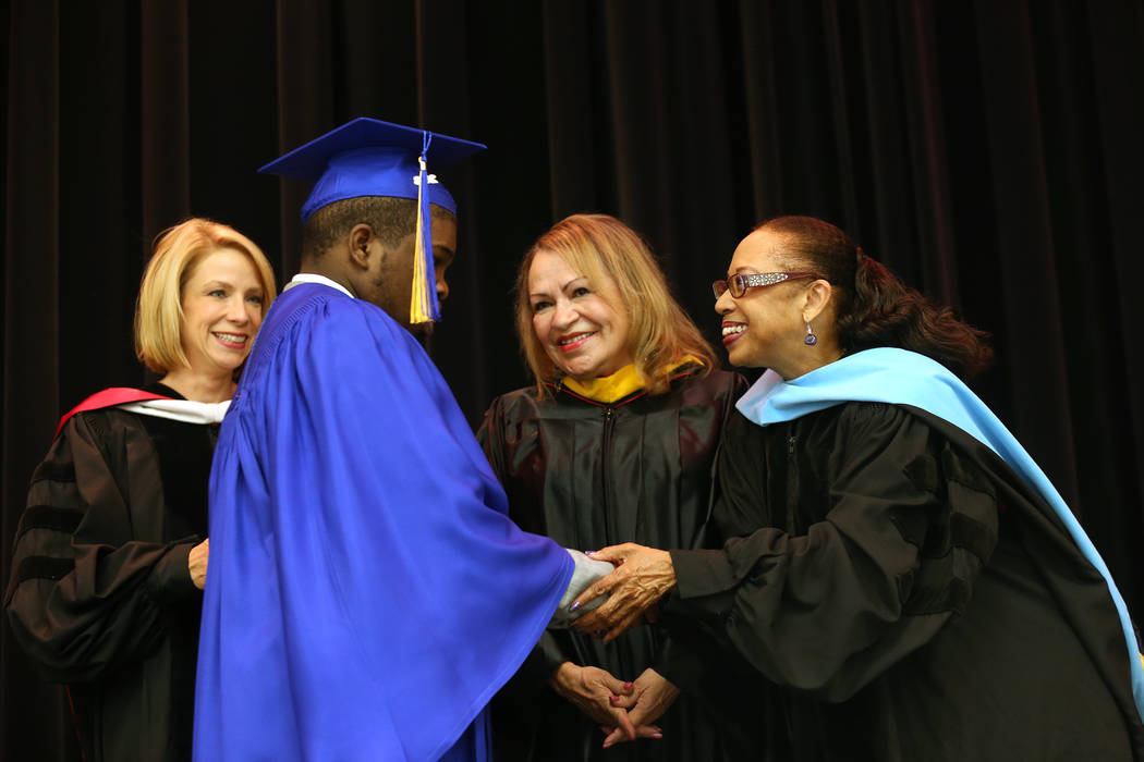 School board trustee Dr. Linda Young congratulates Anthony Carter-Martin as Dr. Deanna Jaskolski, left, and school board trustee Linda Cavazos during a graduation ceremony at Helen J. Stewart School, ...